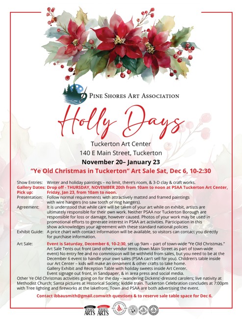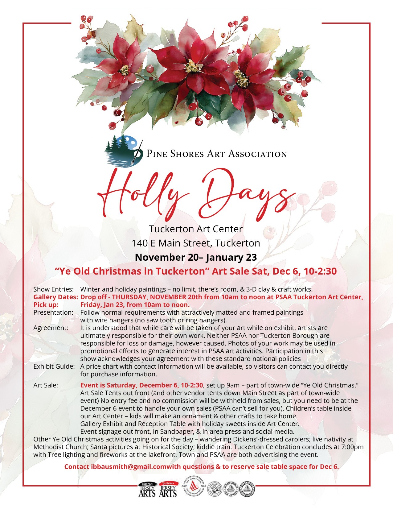 Here is the revised 2025 Gallery Schedule with adjustments for cancellation of the Art Harvest Show at Stafford and revised drop off and hang dates for the current Featured Artist and Holly Days Shows at Tuckerton.
