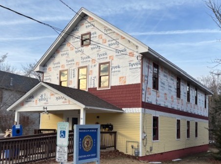 October 17th update: The windows have all been replaced and the lower half of the building has new cedar clapboard siding with a fresh yellow coat of paint and freshly painted white trim. The upper exterior of the building is waiting for new imitation cedar shakes, dark red vinyl shingle siding is to be installed along with the final trim on the outside off the upper windows.